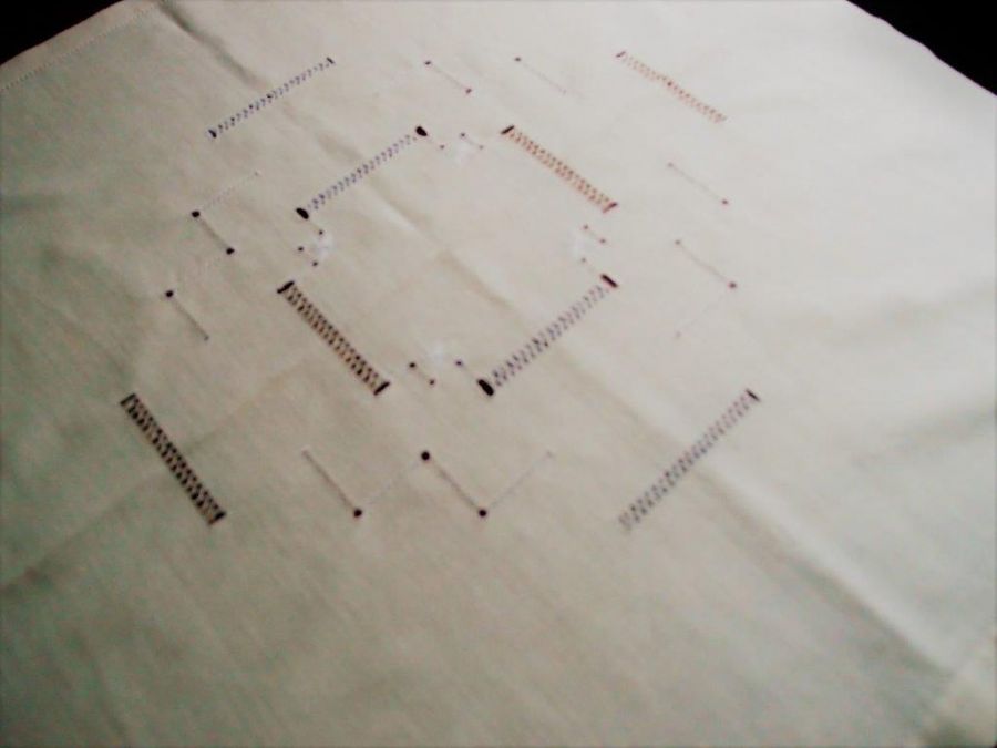 Beskrivning Broderad duk med hålsöm. Utdragssöm. Gulaktigt vit färg.