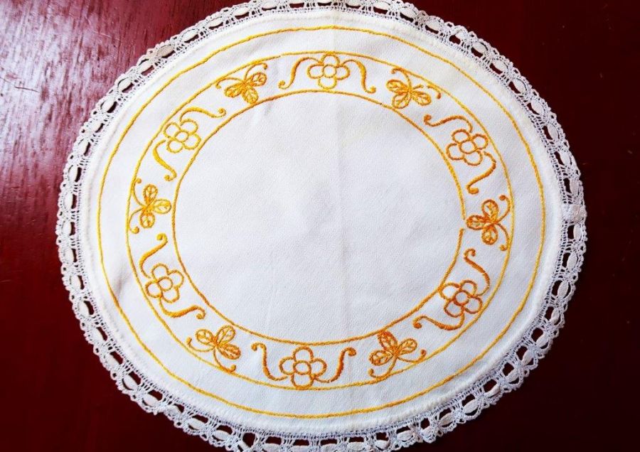 Oval duk med spetskant.