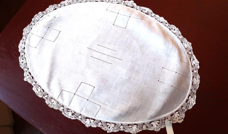 Beskrivning Oval duk med hålsöm och kantspets. Bomullsbatist.