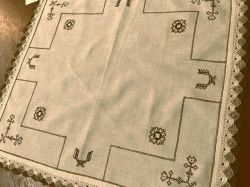 Beskrivning 2 Broderade Dukar med med spetskant. Mycket små korsstygn. Ljust beige och brunt broderi. Pris per styck kr.100.-