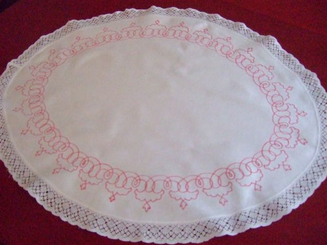 Beskrivning Brickduk med virkad kantspets. Cirka 1910-tal.